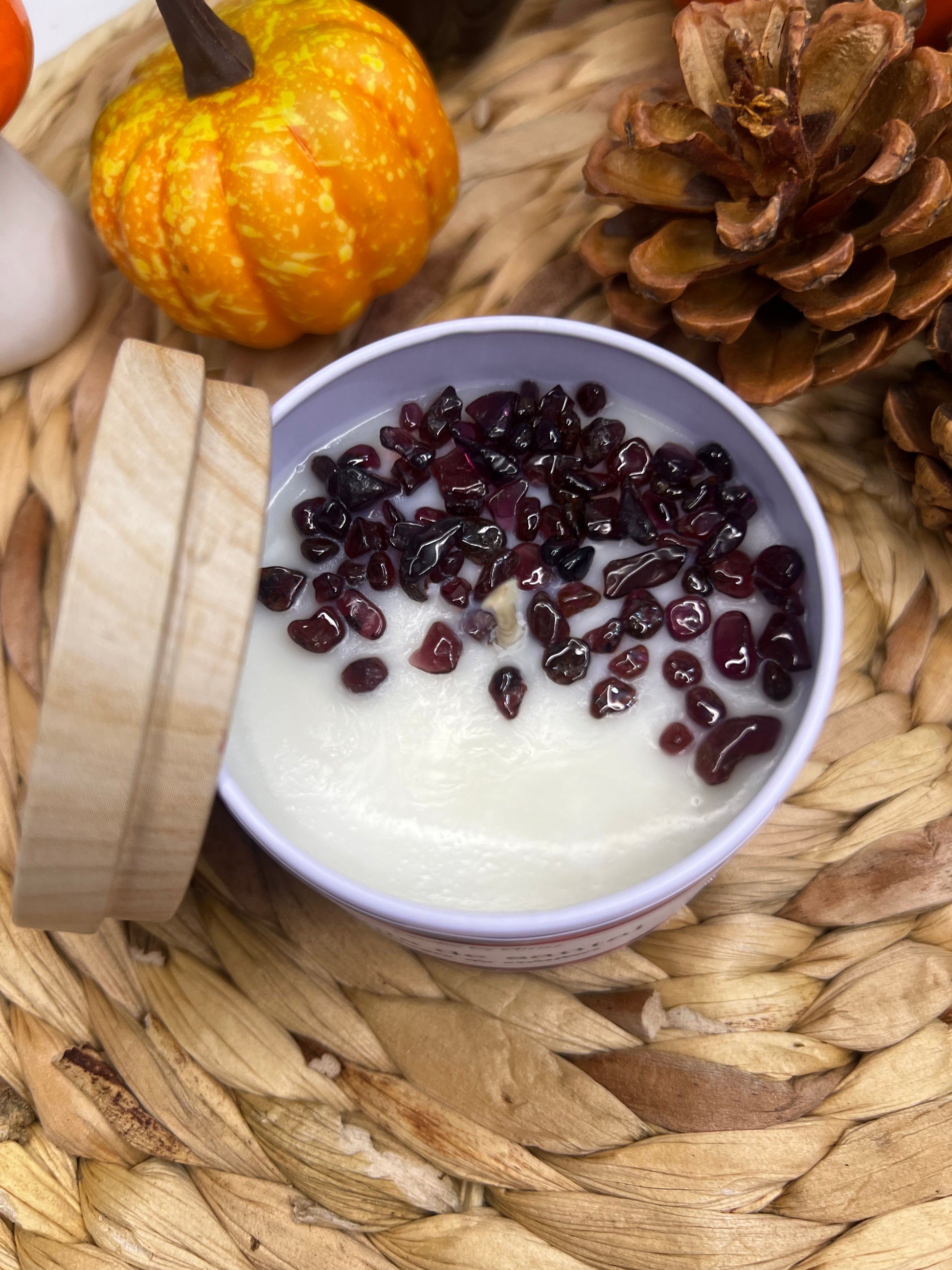 Appréciez l'harmonie délicate de cette bougie parfumée au bois de santal, reconnue pour son arôme chaud et apaisant. Chaque bougie est ornée de pierres en grenat, connues pour leurs propriétés énergisantes et revitalisantes. Ce mariage unique invite à la relaxation tout en stimulant l'esprit, créant une atmosphère équilibrée et sereine dans votre espace. Idéale pour des moments de méditation ou de calme, cette bougie allie élégance et bien-être.